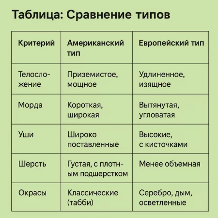 Сегодня разделение на типы стало условным. Многие кошки сочетают черты обоих направлений: например, массивность «американца» и вытянутую морду «европейца». Ответственные заводчики фокусируются не на типе, а на здоровье, соответствии стандарту породы и социализации котят.